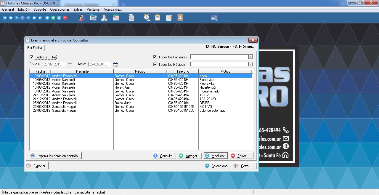 - Visualización de Consultas General, en Fecha, por Paciente y/o por Médico.